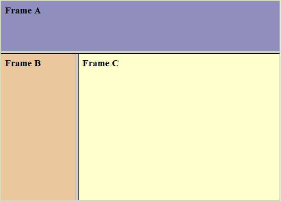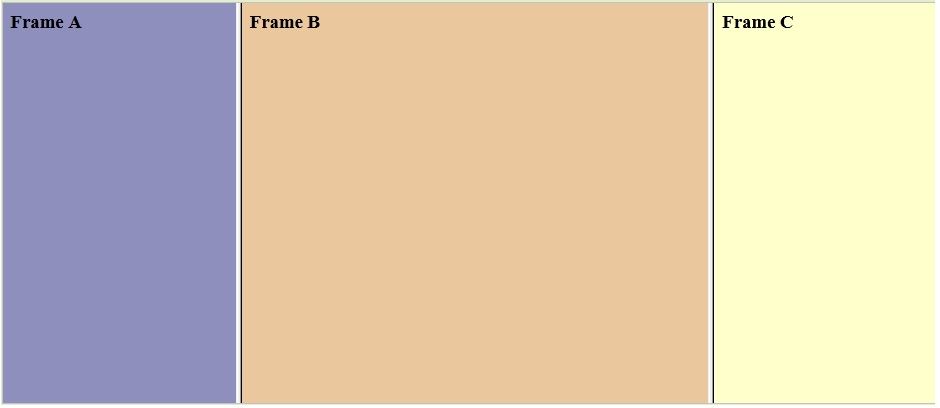 <html> <frameset cols="25%,*,25%"> <frame src="frame_a.htm" /> <frame src="frame_b.htm" /> <frame src="frame_c.htm" /> </frameset> </html>