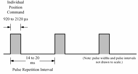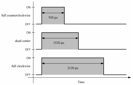 En servomotors position angives med en puls[1], der ved hjælp af pulslængden angiver hvilken position man ønsker servoen skal stå i: